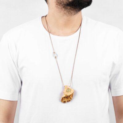 گردنبند چوبی دست‌ساز نتیجه‌ی کار مستقیم هنرمند با متریال طبیعی است؛ نه مونتاژ قطعات آماده یا تولید انبوه کارخانه‌ای. در این نوع گردنبندها، انتخاب چوب، برش، پرداخت و حتی ترکیب متریال‌ها با دقت و نگاه هنری انجام می‌شود.