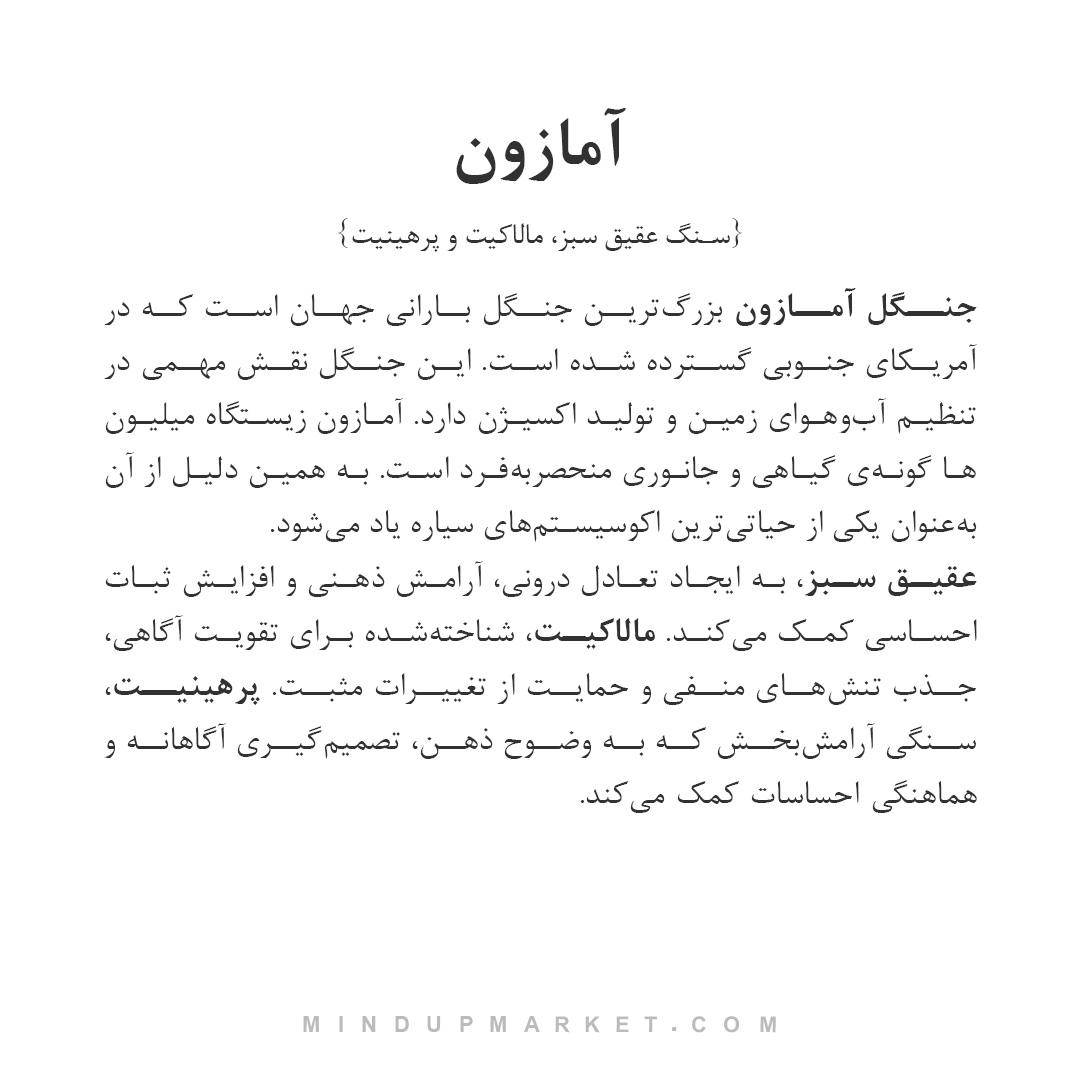 آمازون الهامگرفته از جنگلی است که قلب تپندهی طبیعت به شمار میآید؛ جایی که حیات، تعادل و جریان زندگی بهصورت همزمان حضور دارند. این مدل یادآور ثباتی است که از ریشه میآید، نه از سکون؛ ثباتی زنده، پویا و در حال رشد. آمازون برای کسانی طراحی شده که میخواهند ذهنشان آرام باشد، اما از حرکت و تغییر نترسند. این دستبند سنگی عقیق سبز و پرهینیت حس اتصال به زمین و زندگی را تقویت میکند و به فرد یادآوری میکند که میتوان هم ریشهدار بود و هم رو به جلو حرکت کرد. حضور آن آرام است، اما عمق و معنا را بهتدریج منتقل میکند.