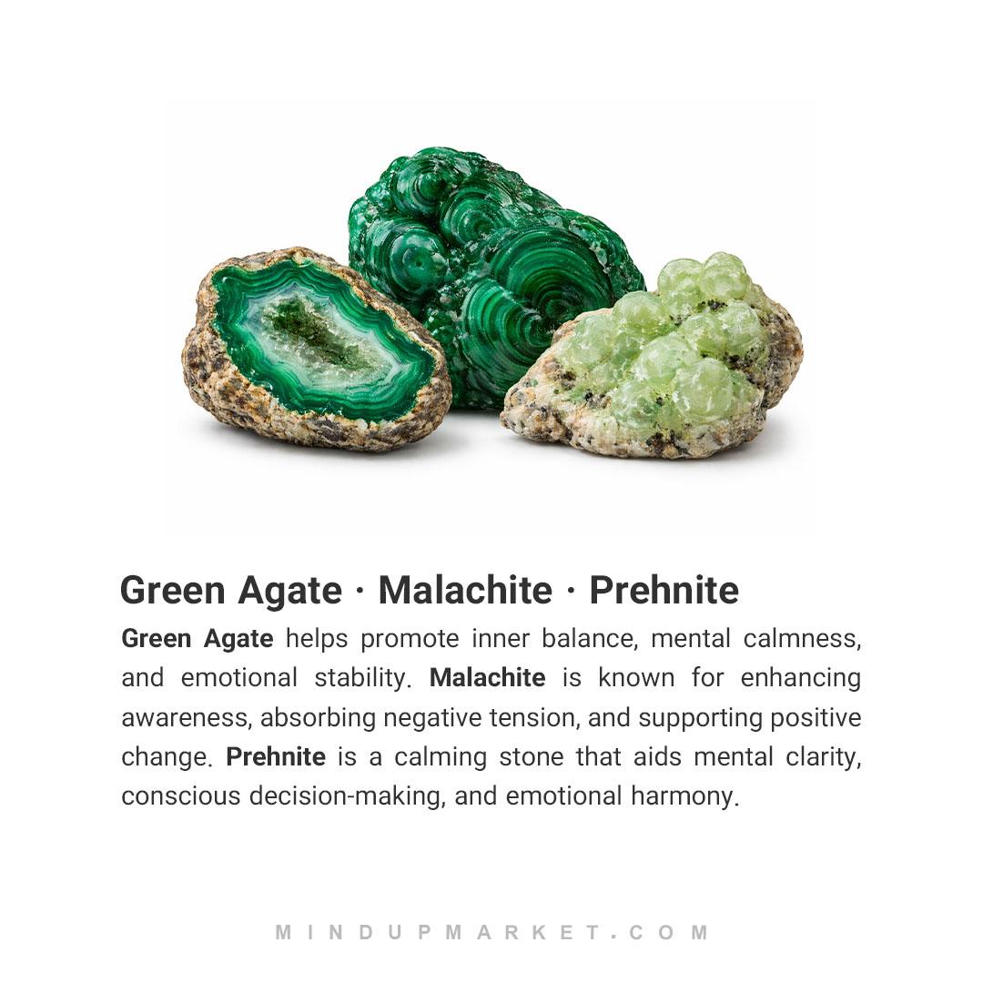 - ساختهشده از سنگ عقیق سبز، پرهینیت و مالاکیت، سنگی برای ثبات ذهن و تقویت قلب.