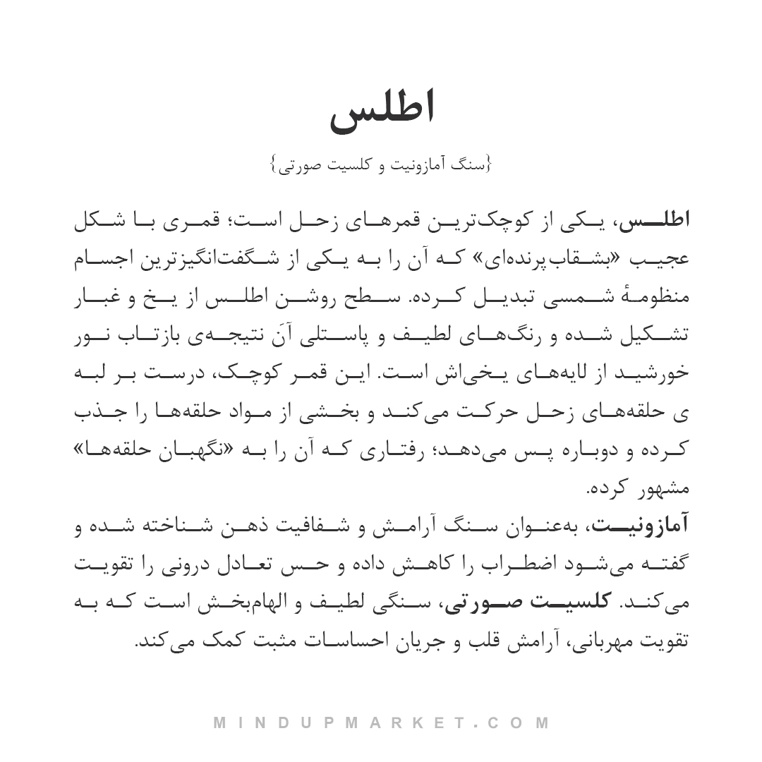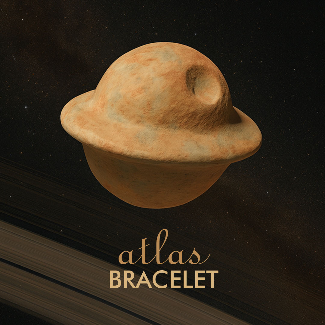 اطلس نام یکی از کوچک‌ترین قمرهای زحل است؛ جرمی روشن که در لبه‌ی حلقه‌های این سیاره حرکت می‌کند و با سطح براق و رنگ‌های لطیف خود شناخته می‌شود. این قمر کوچک، با جذب و بازگرداندن ذرات اطرافش، نمادی از تعادل و پایداری در میان حرکت و فشار است. طراحی دستبند سنگی اطلس نیز با الهام از همین مفهوم شکل گرفته؛ یادآور این‌که حتی در شلوغ‌ترین مدارها هم می‌توان آرام، ثابت و متعادل باقی ماند.