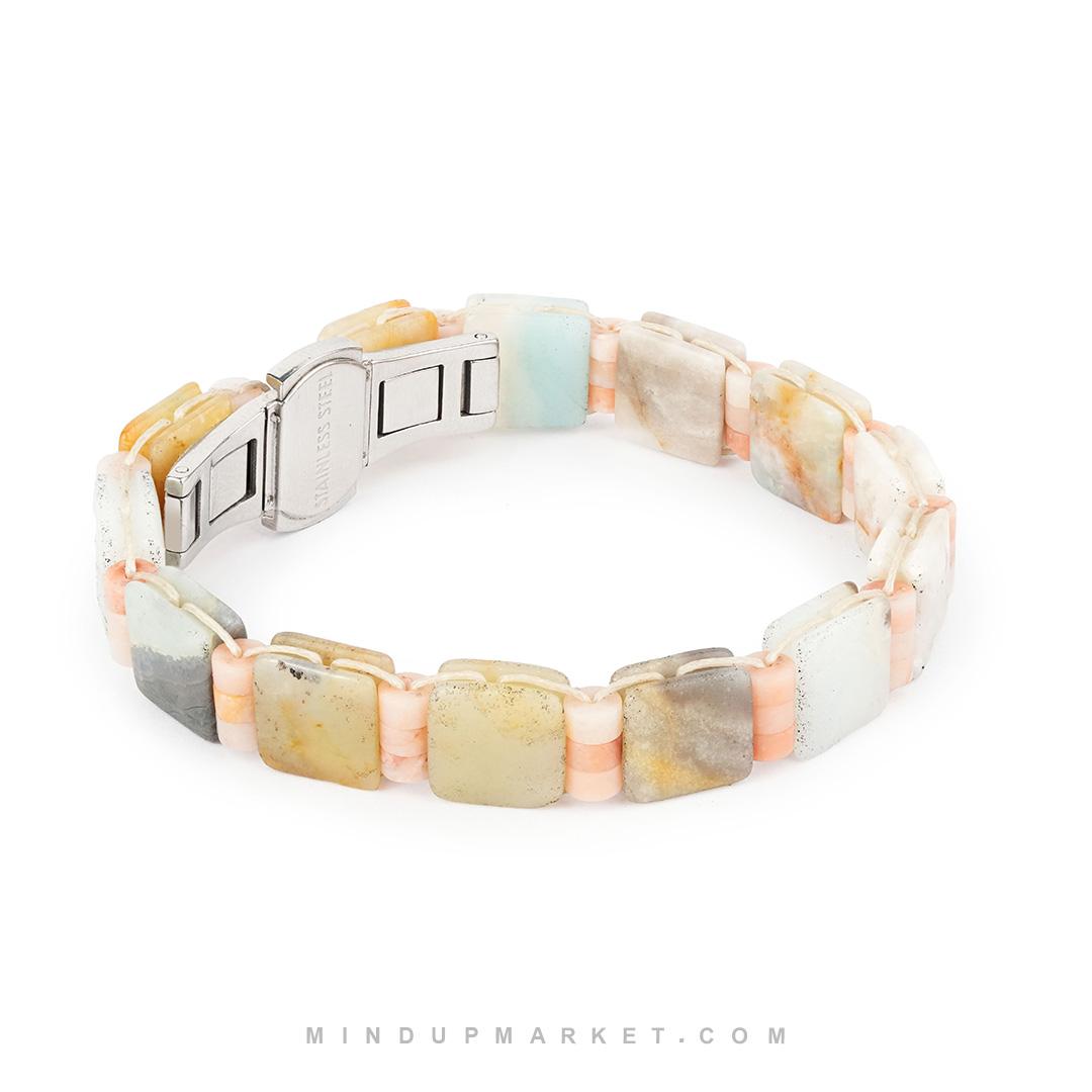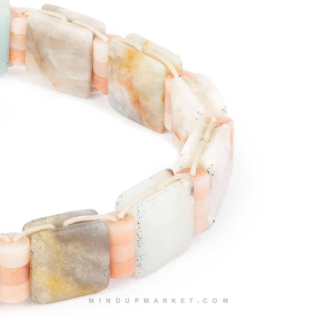 در ساخت این دستبند سنگی دست‌ ساز از سنگ‌ های آمازونیت و کلسیت صورتی استفاده شده است؛ ترکیبی که به‌صورت نمادین با آرامش، تعادل و لطافت احساسی شناخته می‌شود. آمازونیت با طیف سبز–آبی ملایم خود، حس کاهش تنش‌های ذهنی و ثبات درونی را القا می‌کند و کلسیت صورتی با انرژی لطیفش، به ایجاد آرامش قلب و پذیرش احساسات کمک می‌کند. کنار هم قرار گرفتن این دو سنگ، کیفیتی متعادل و پیوسته می‌سازد که برای استفاده روزمره کاملاً مناسب است.