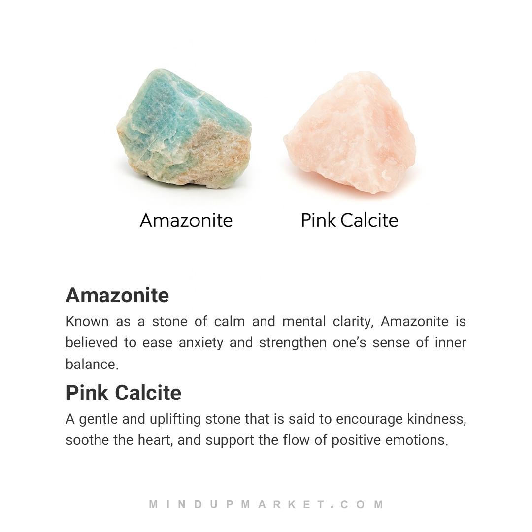 • ساخته‌شده از سنگ آمازونیت و کلسیت صورتی، سنگی برای آرامش قلب و تعادل احساسات.