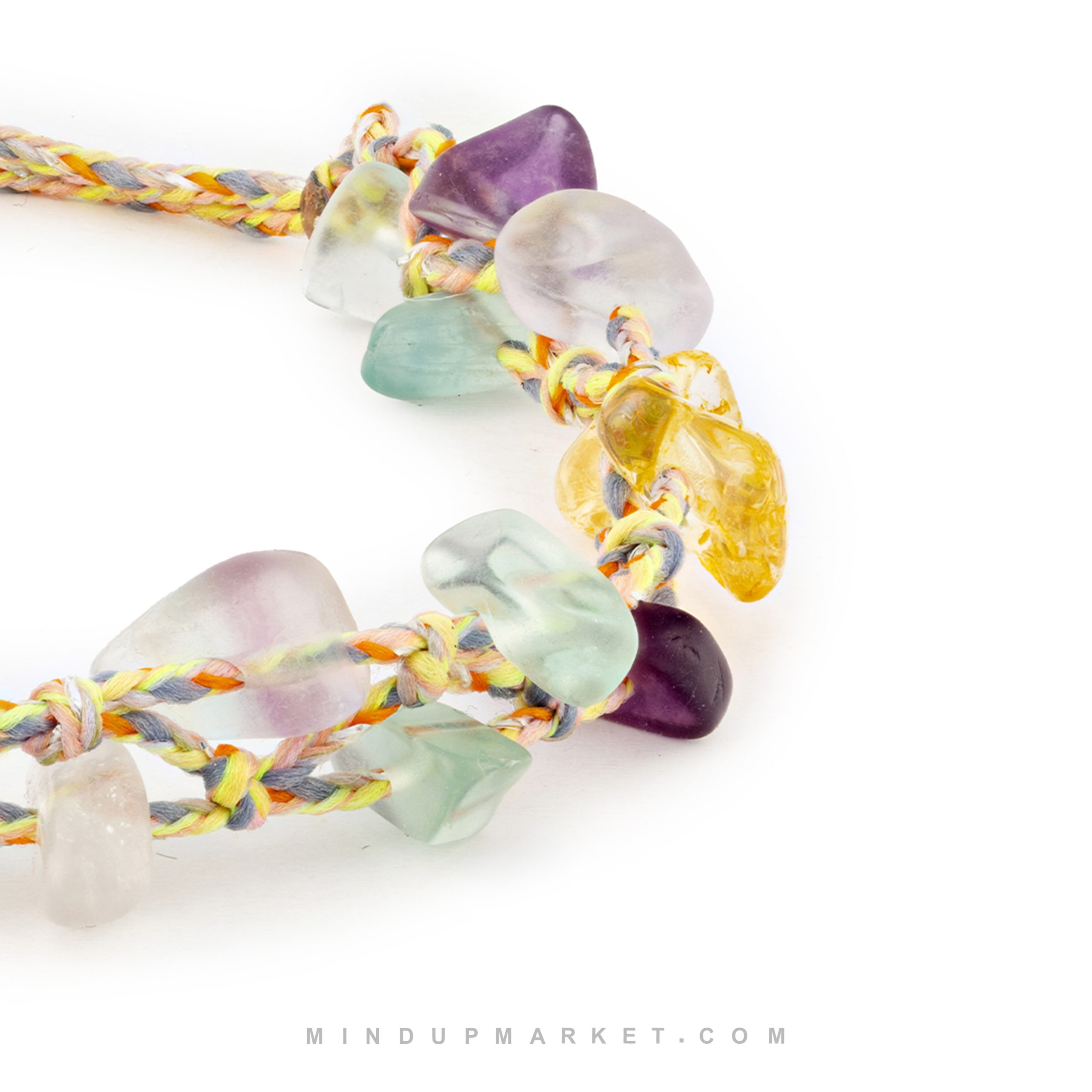 بافت نخ های رنگی علاوه بر زیبایی، باعث انعطاف پذیری و سبکی این دستبند شده و آن را به گزینه ای مناسب برای استفاده روزمره تبدیل کرده است. وجود قفل کشویی در این طراحی، امکان تنظیم سایز را فراهم میکند و باعث راحتی در استفاده میشود. این دستبند برای افرادی که به زیورآلات طبیعی و خاص علاقه دارند، یک گزینه ایدهآل است و میتواند به عنوان هدیه ای متفاوت و انرژی بخش برای عزیزان انتخاب شود. ترکیب رنگ های متنوع سنگ های فلوریت، امکان ست شدن با استایل های مختلف را فراهم میکند و آن را به یک اکسسوری منحصربه فرد و جذاب تبدیل کرده است.