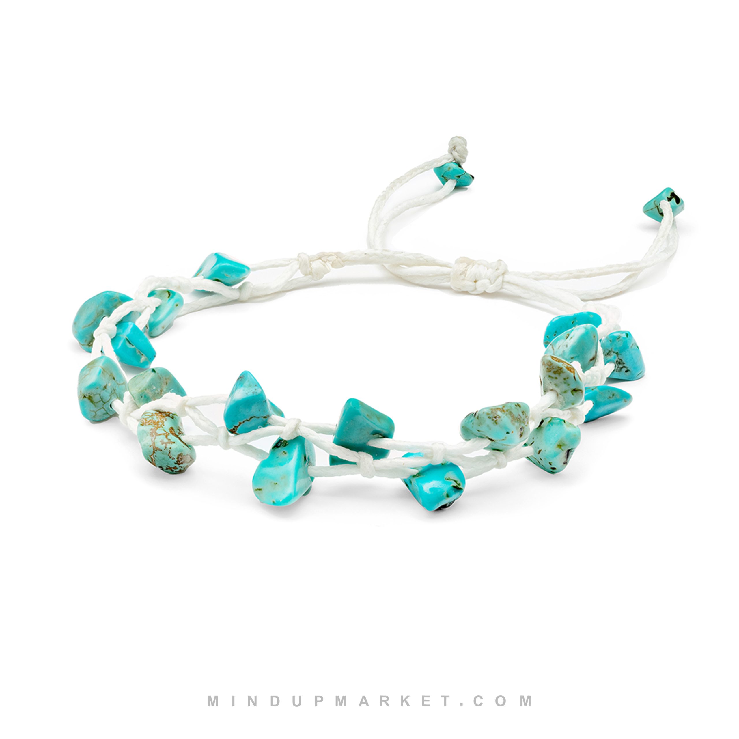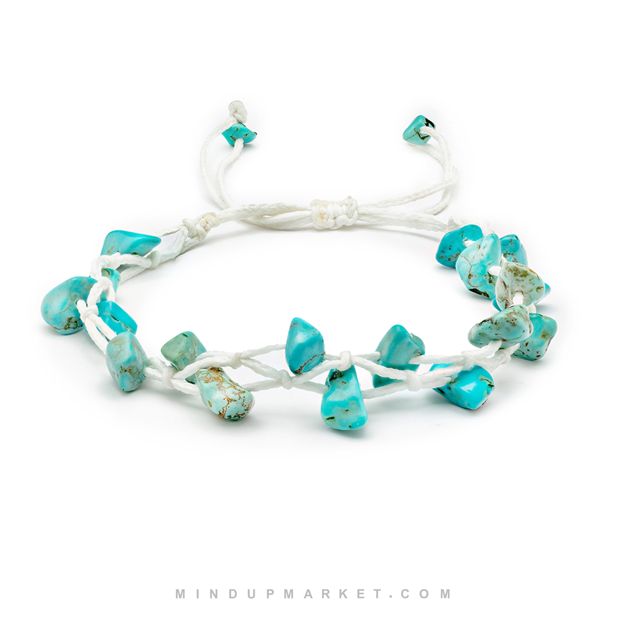 بافت نخی این دستبند، علاوه بر ایجاد استحکام و دوام بالا، امکان تنظیم سایز را نیز فراهم میکند، به طوری که افراد با مچ های مختلف میتوانند به راحتی از آن استفاده کنند. ترکیب رنگ های آبی فیروزهای و رگه های طبیعی سنگ، جلوهای خاص به این محصول داده و آن را برای استفاده روزمره یا استایل های خاص و رسمی مناسب ساخته است.