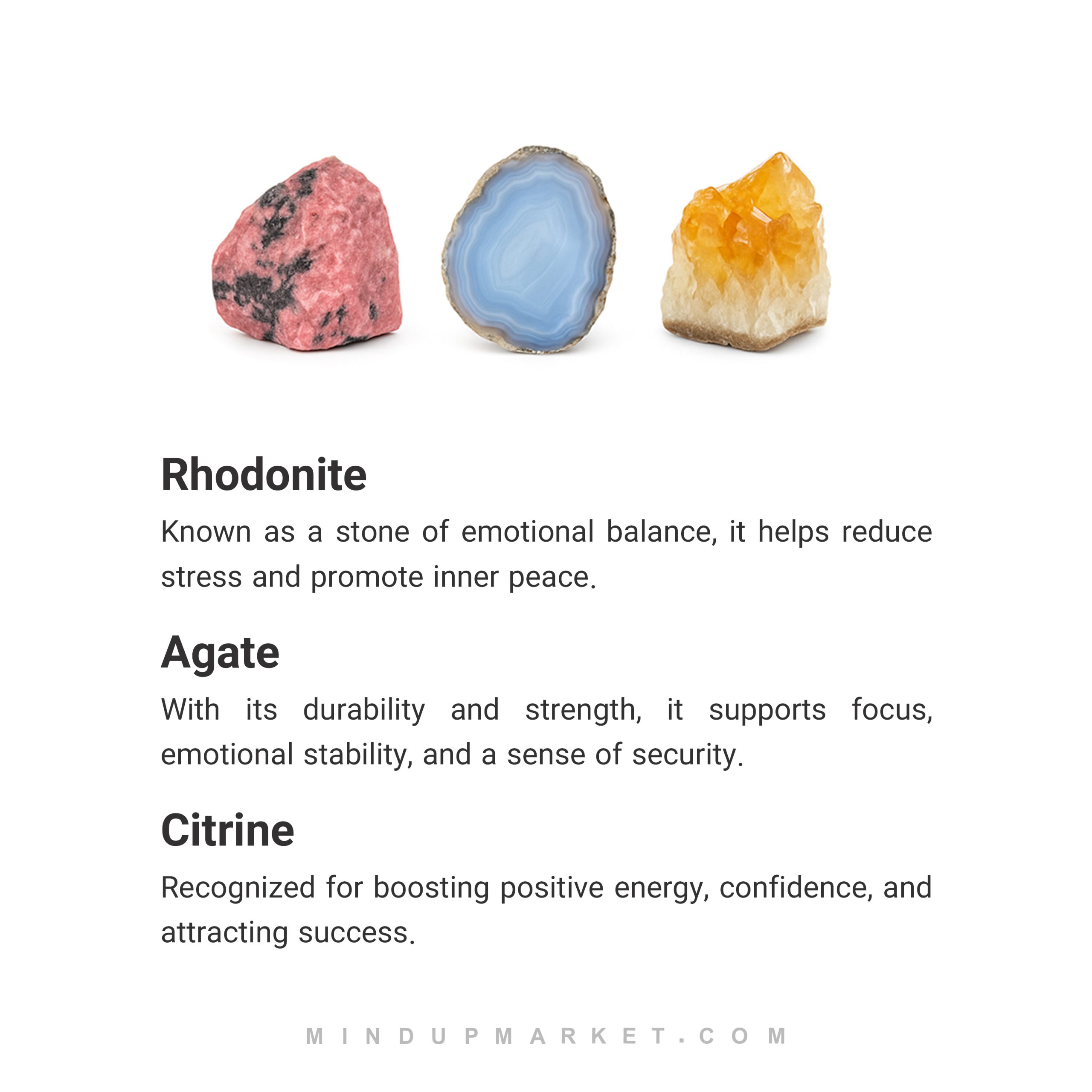 - ردونیت برای عشق، سیترین برای ثروت و عقیق آبی برای آرامش.