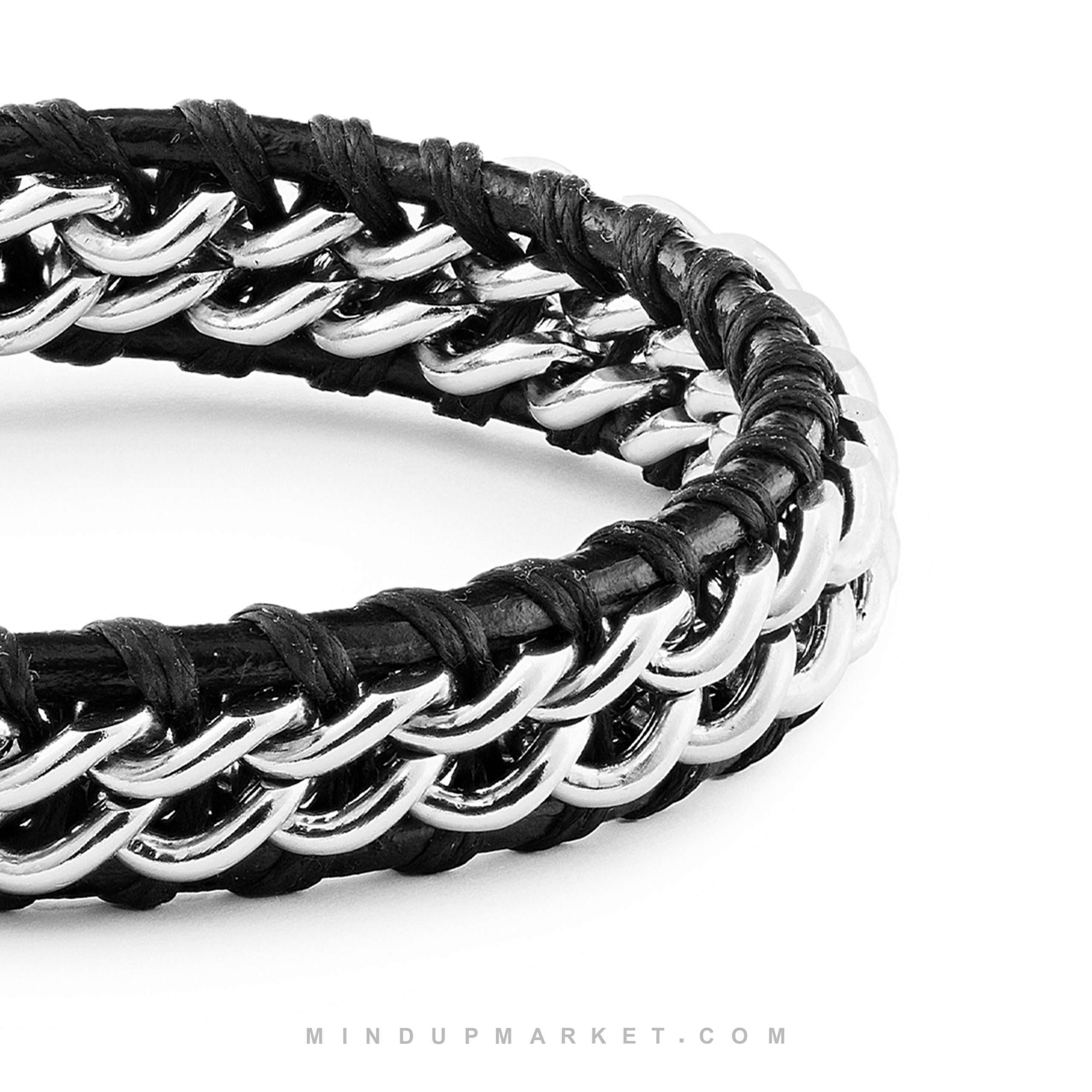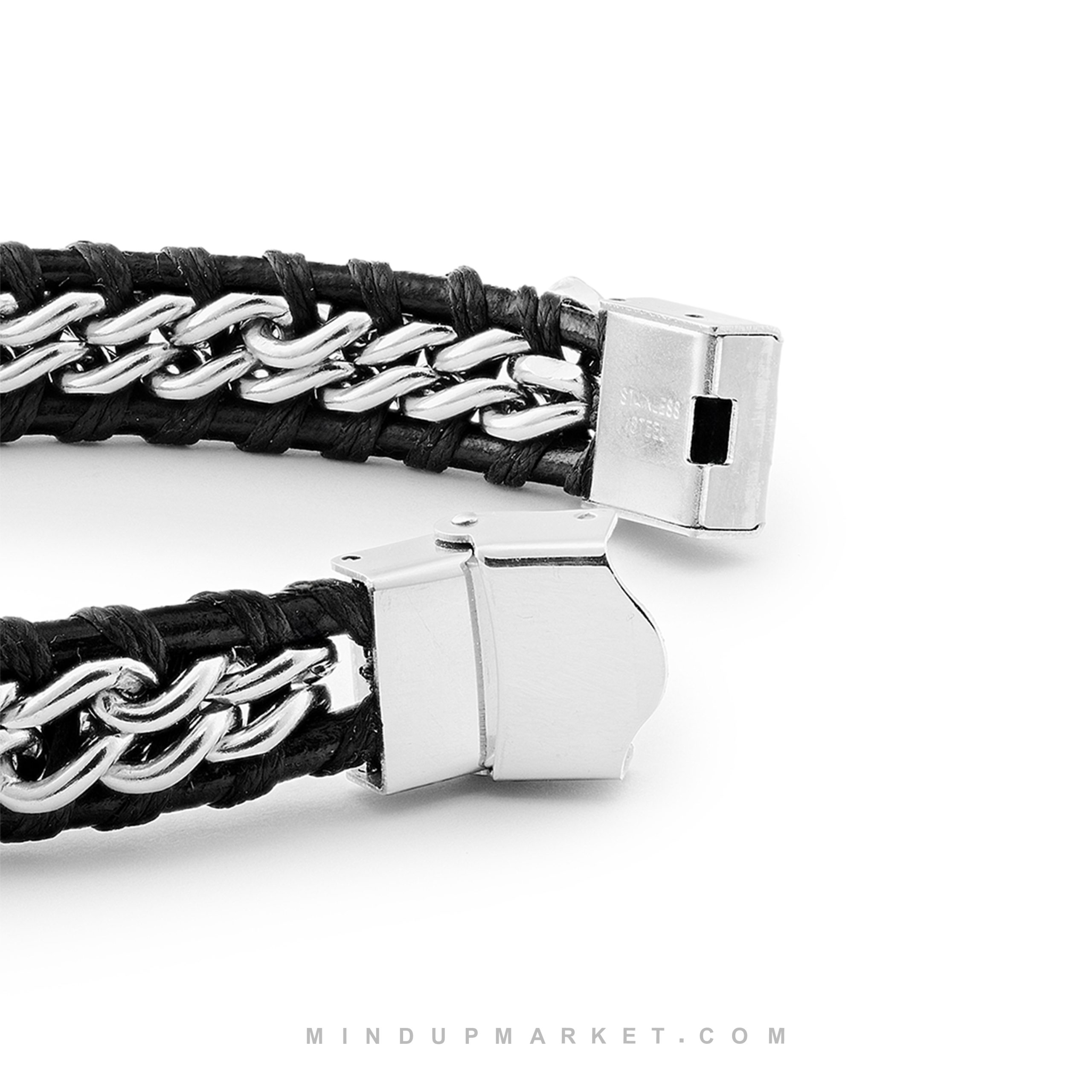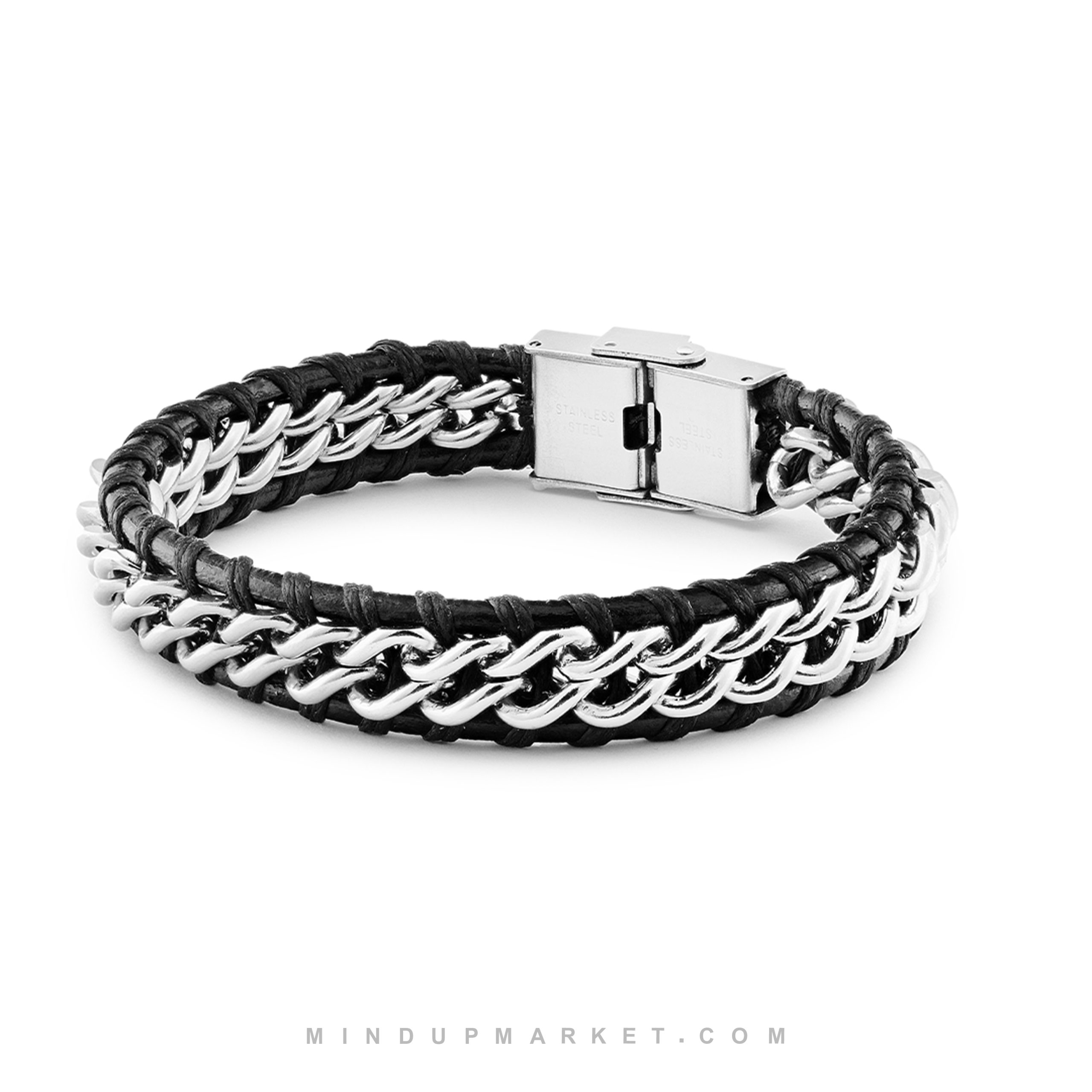 •  دستبند چرم و رنجیر کارتیر نقره ای طرح سونامی