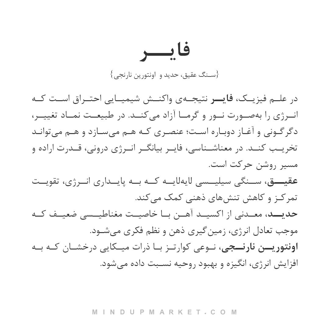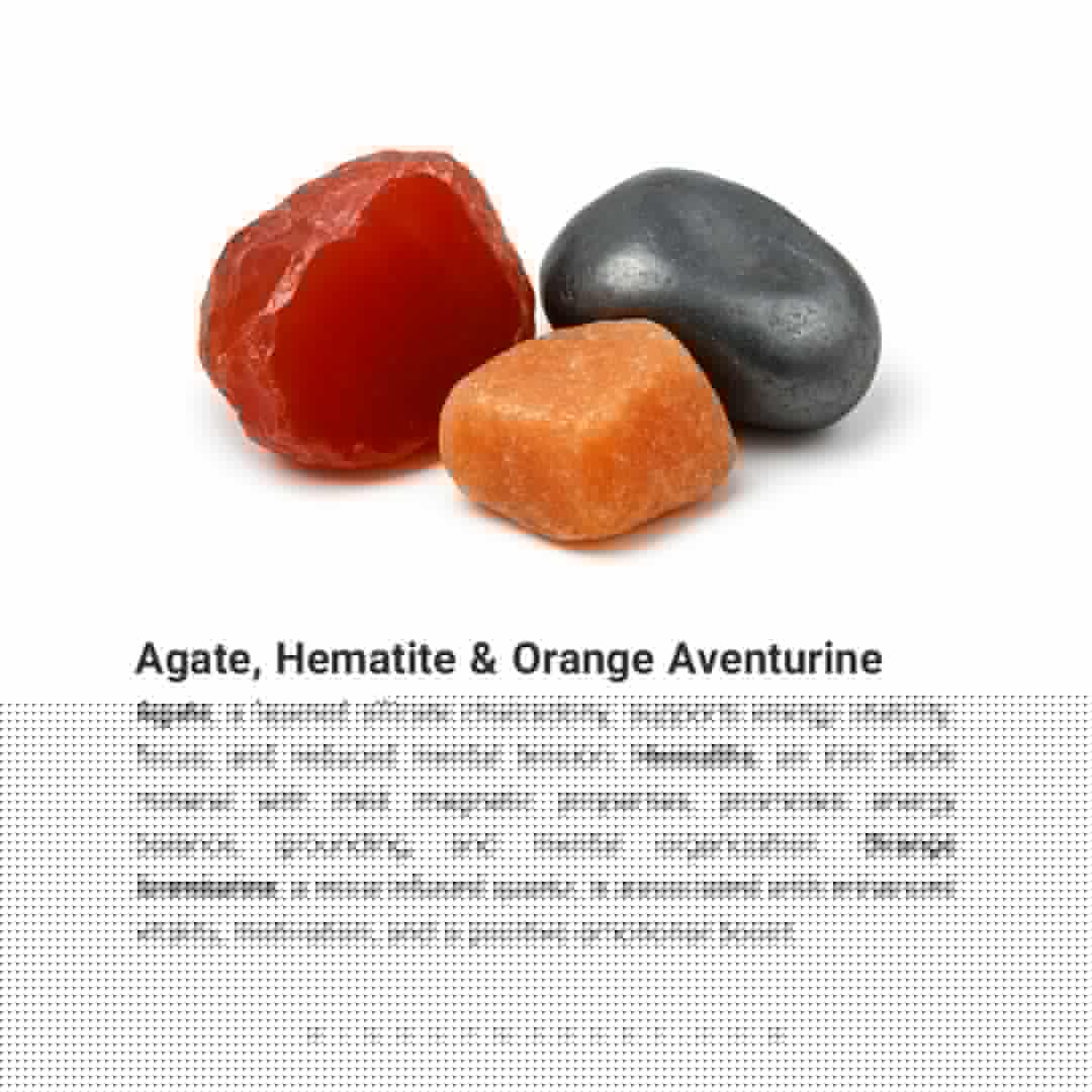 • ساخته‌شده از سنگ عقیق، حدید و اونتورین نارنجی، سنگی برای قدرت، ثبات و شروع دوباره.