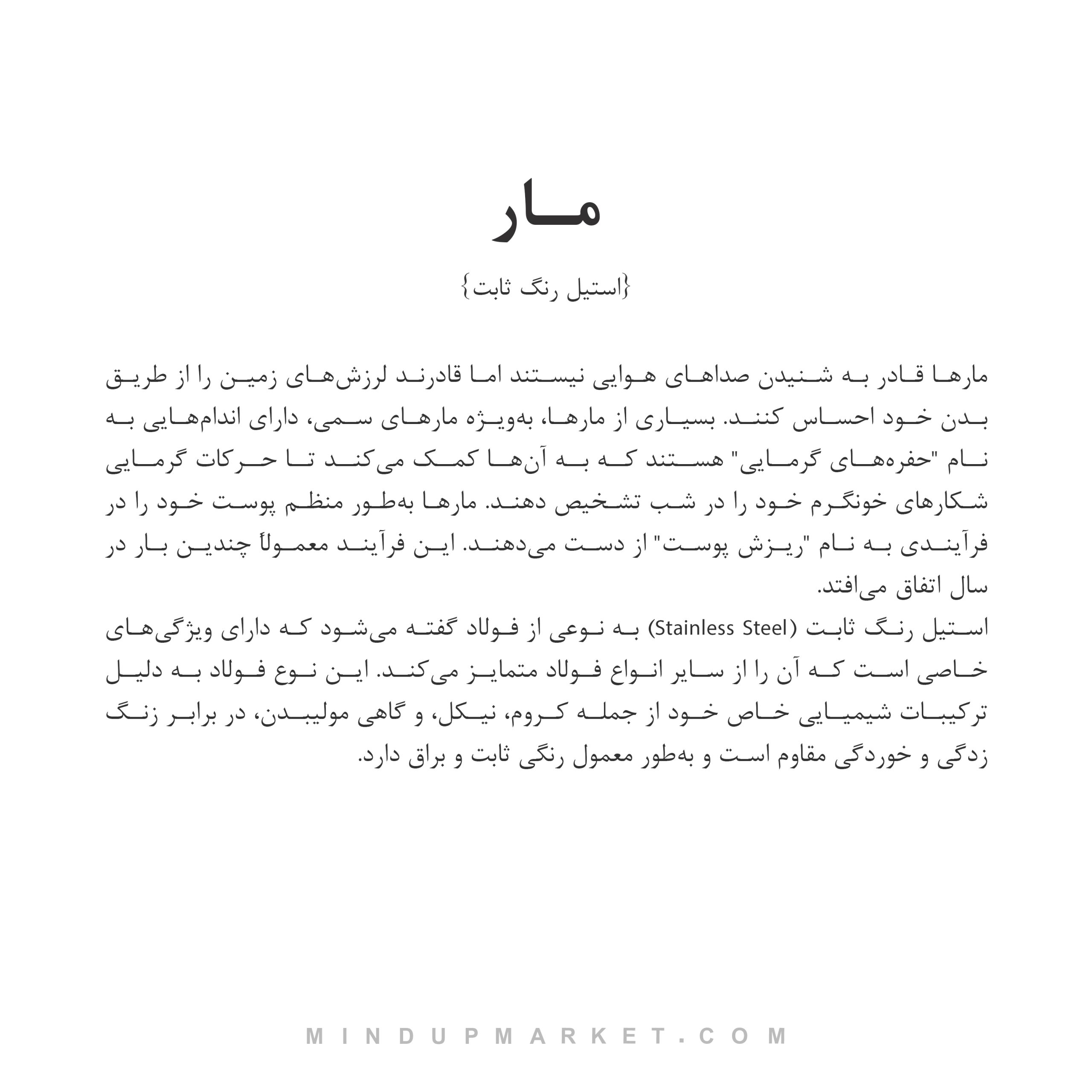 دستبند مار یکی از محبوب ترین زیورآلات مدرن است که این روزها طرفداران زیادی پیدا کرده است. اگر به دنبال خرید دستبند مار با کیفیتی عالی و دوام بالا هستید، فروشگاه مایندآپ مارکت میتواند بهترین گزینه برای شما باشد. در این فروشگاه، دستبند مار از جنس استیل درجه یک با رنگ ثابت عرضه شده است که در طول زمان هیچگونه تغییر رنگ و زنگ زدگی نخواهد داشت. طراحی ویژه و جذاب این دستبند باعث شده تا گزینهای مناسب برای استفاده روزمره و همچنین مناسبت های خاص باشد. قفل خاص و ایمن آن نیز علاوه بر زیبایی، به راحتی باز و بسته شده و خیال شما را از باز نشدن ناگهانی راحت میکند.