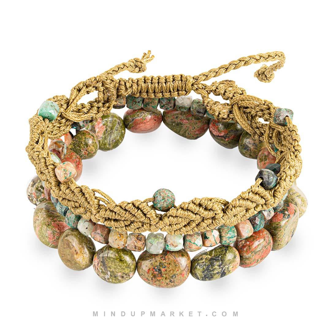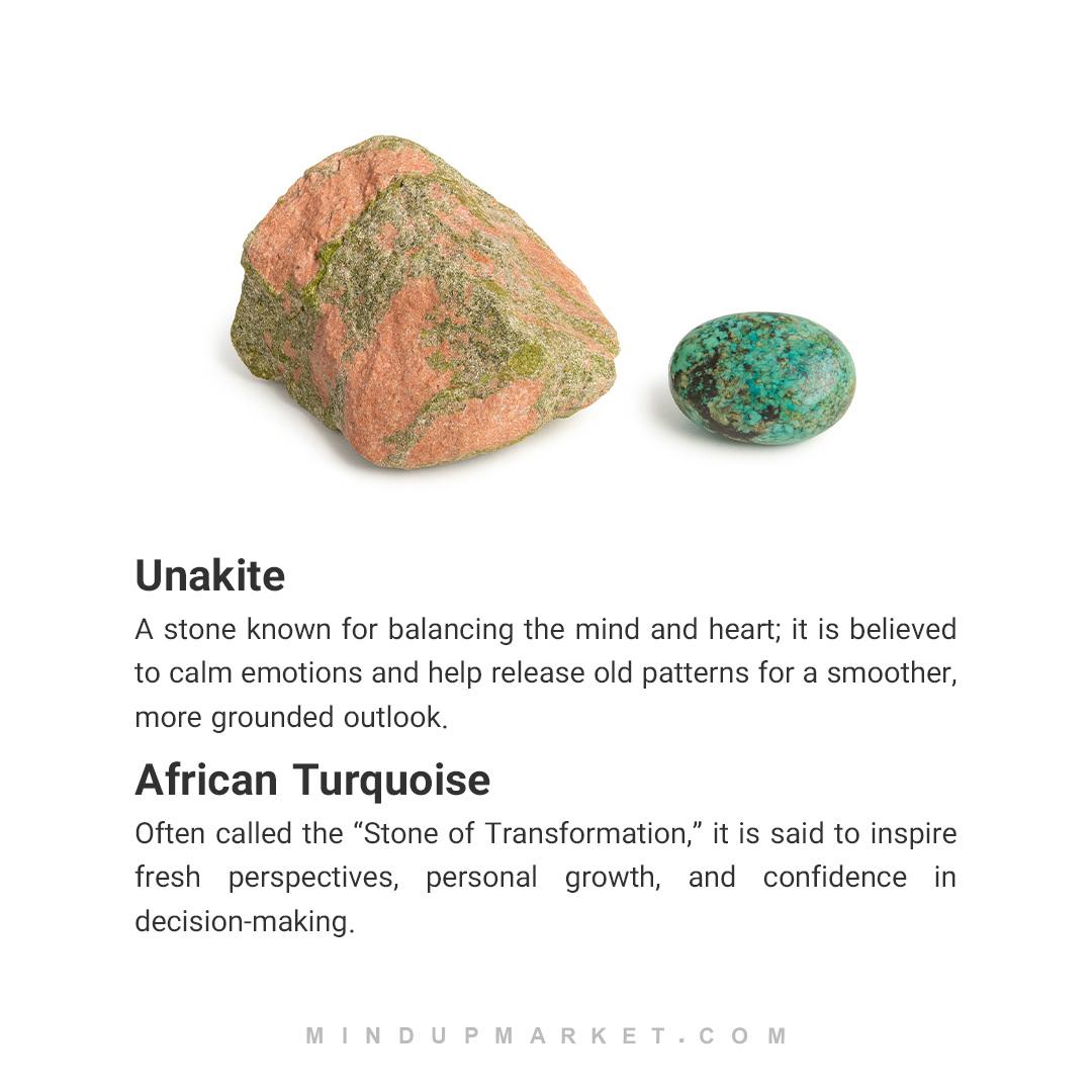 - ساختهشده از سنگ اوناکیت و فیروزه آفریقایی، سنگی برای رهایی از استرس و بازگشت به خود.