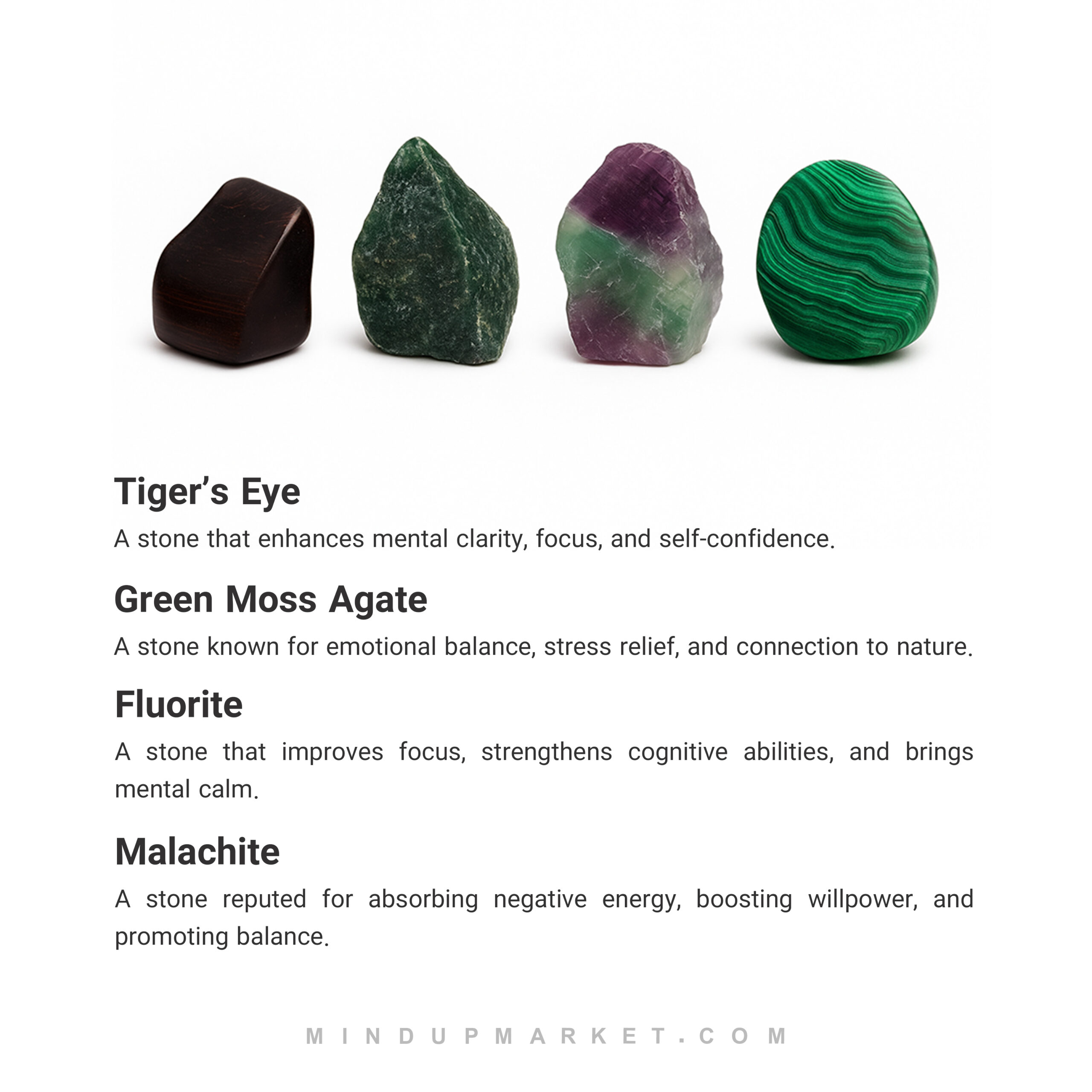 - چشم ببر برای تمرکز، مالاکیت برای آرامش و فلوریت برای وضوح ذهن، عقیق خزهای سبز برای تعادل و رشد درونی.