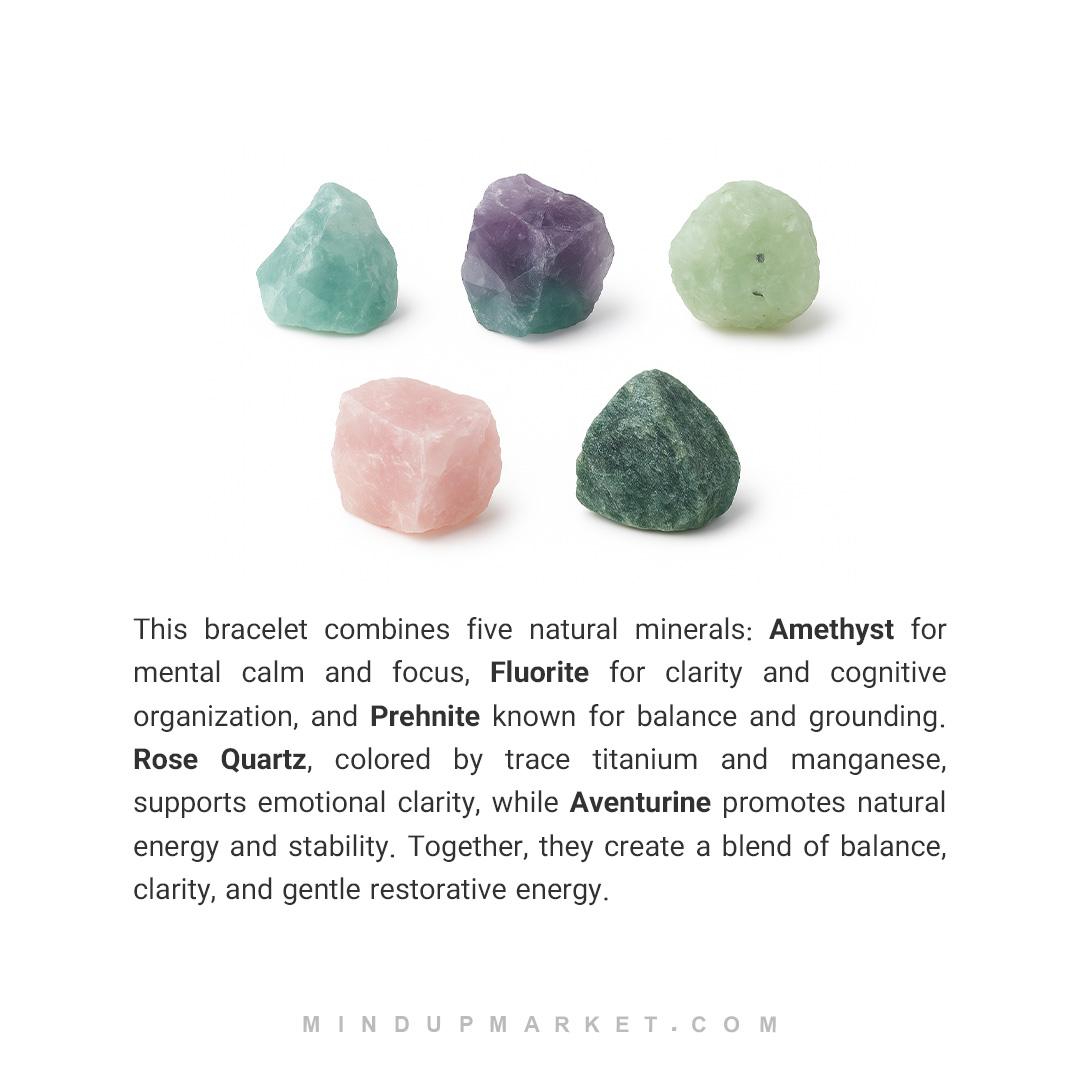 - ساختهشده از سنگ آمیتیست، فلوریت، پرهینیت، رزکوارتز و اونتورین، سنگی برای آرامش، تعادل احساسات و انرژی مثبت.