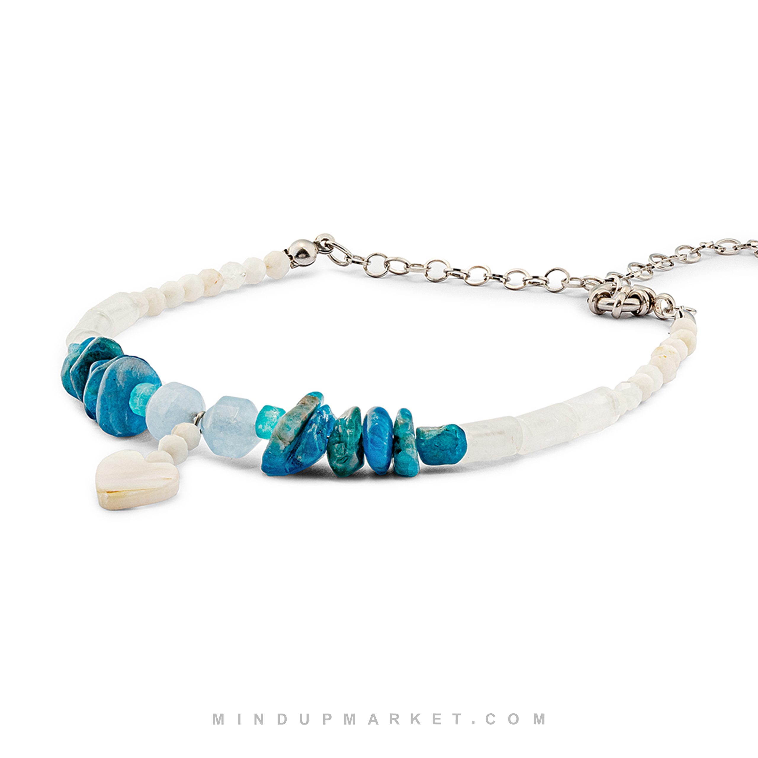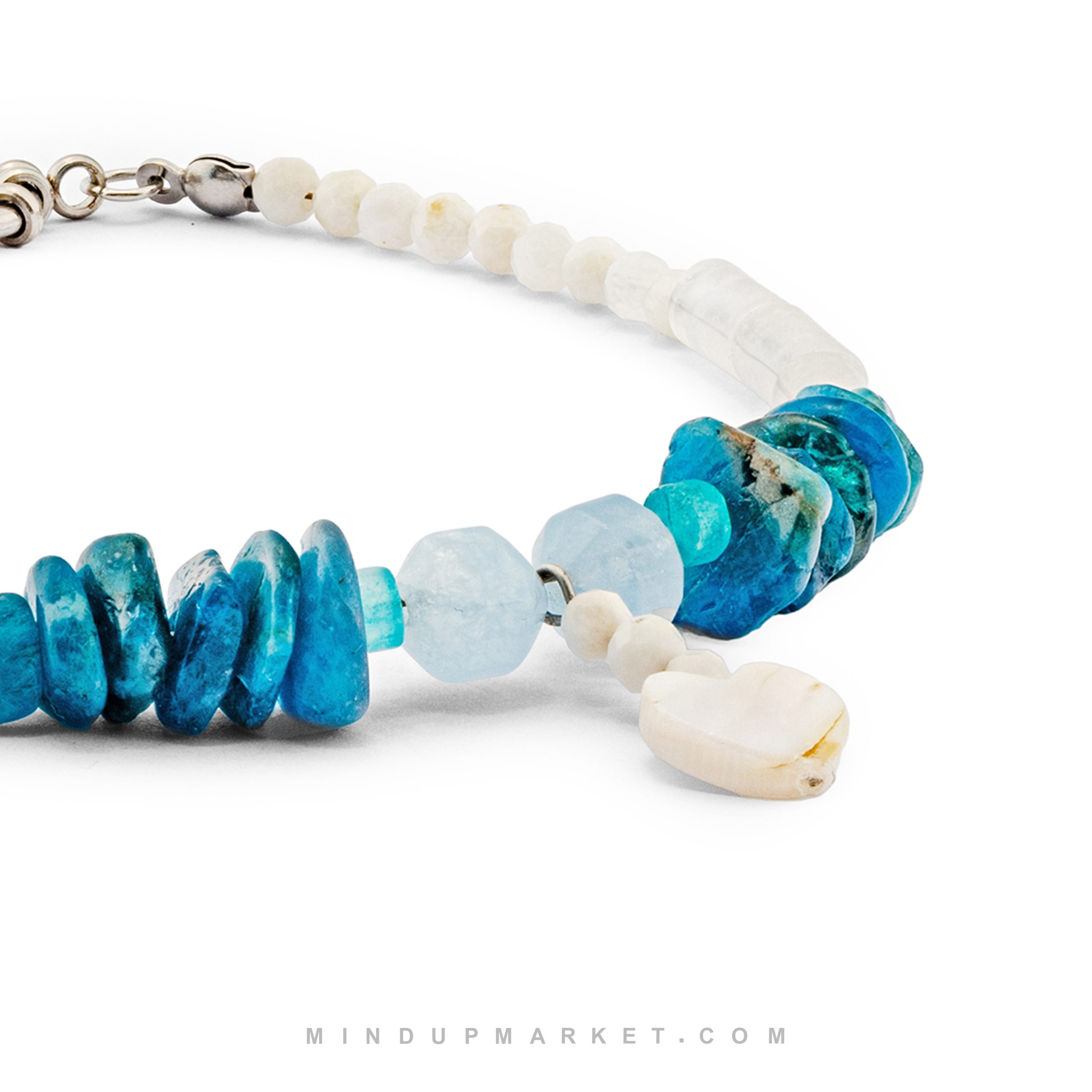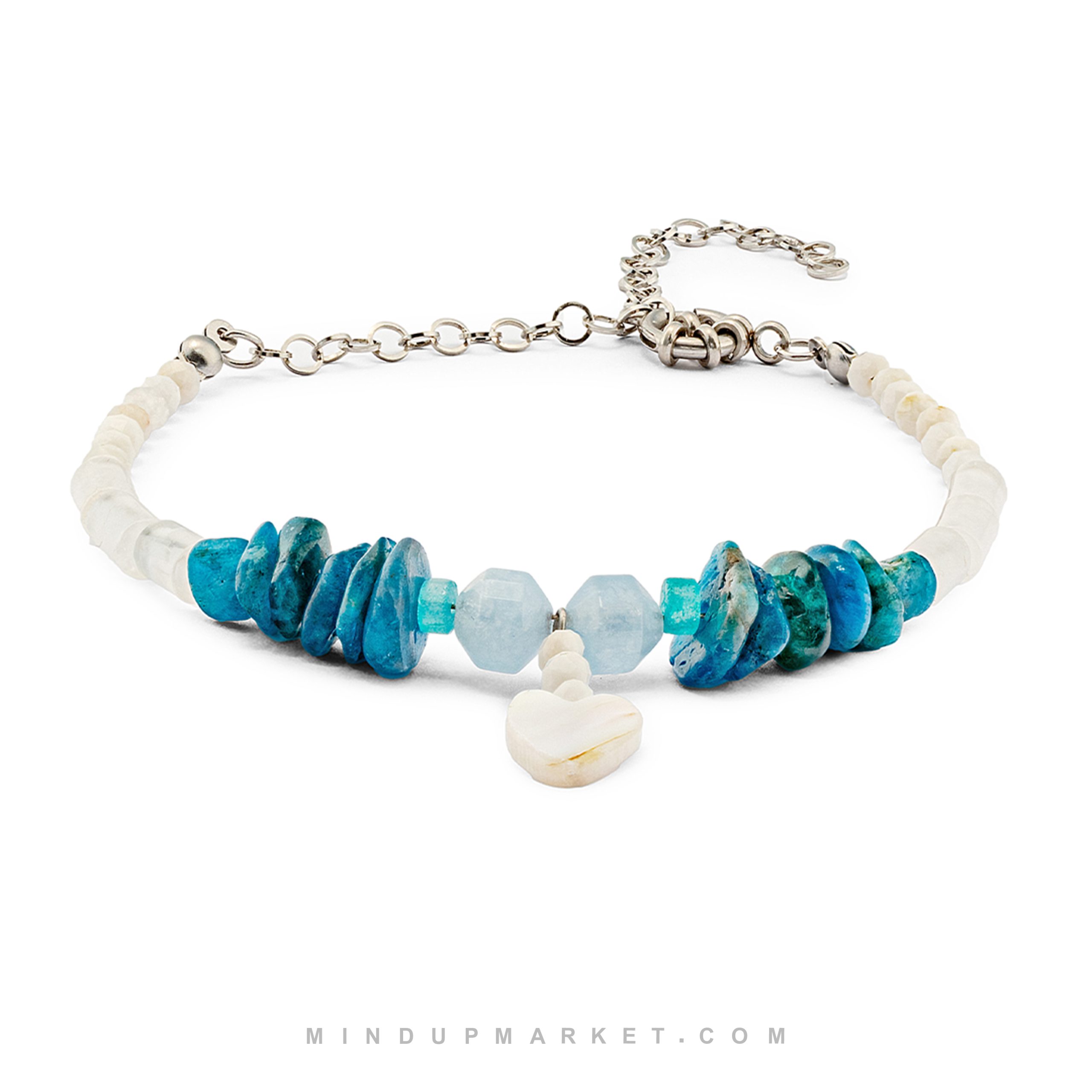 - پابند دلفین ترکیبی خاص از سنگهای آپاتیت، سلنایت، عقیق آبی، صدف و کریستال کوارتز.