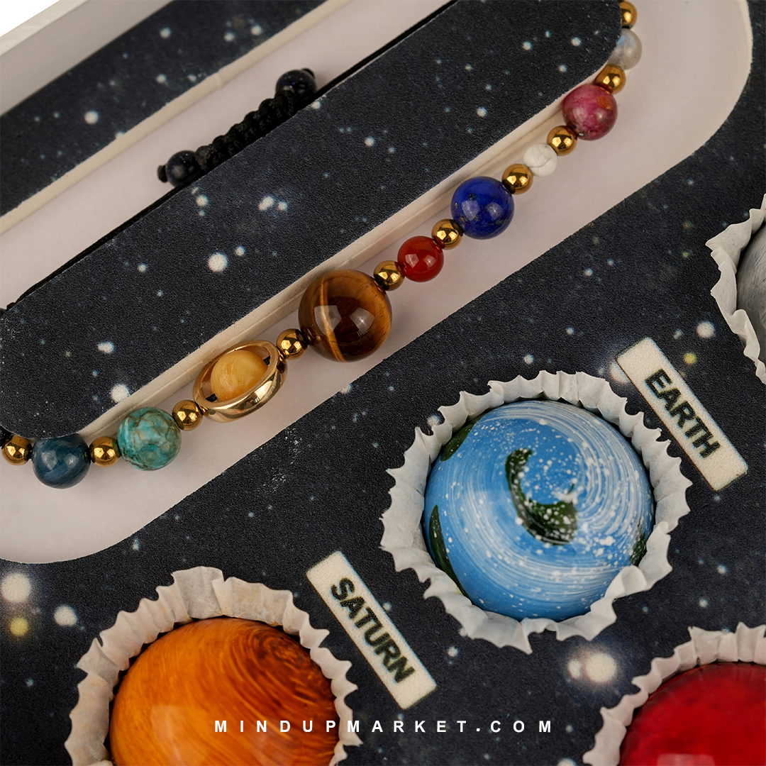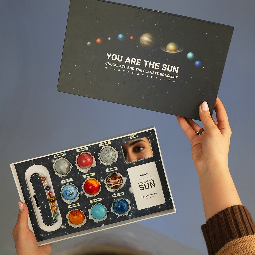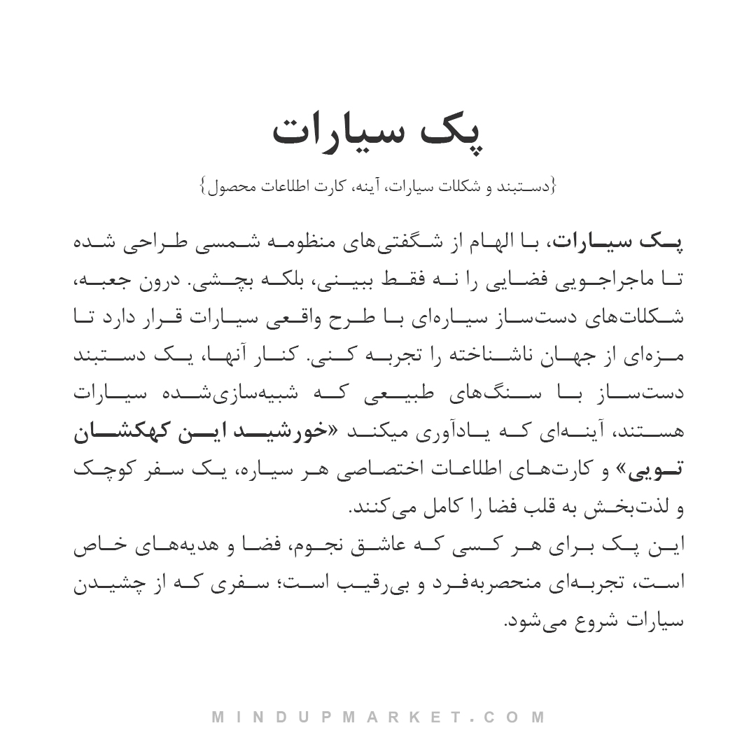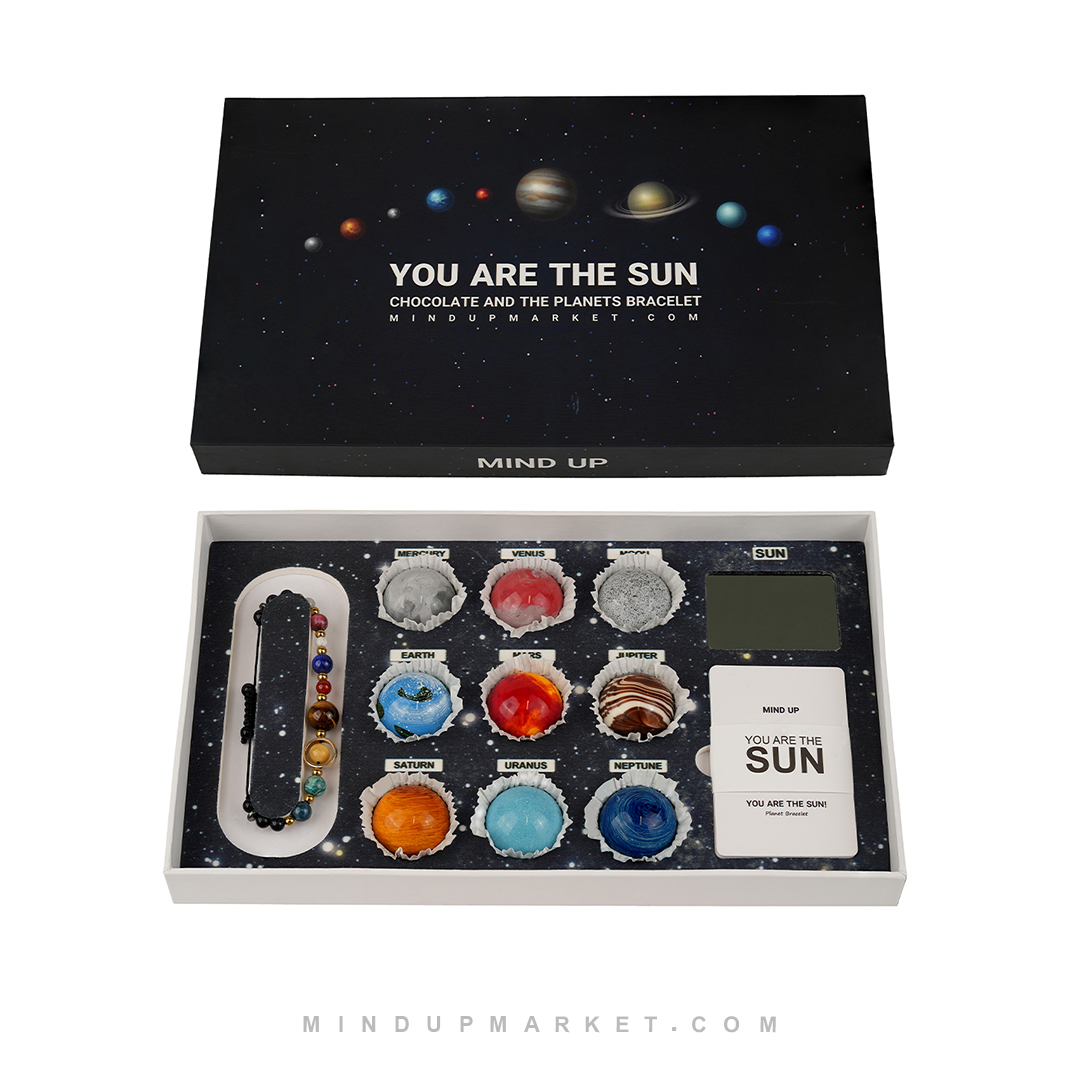 - پک سیارات شکلاتی تشکیلشده از: دستبند سیارات پلاس، شکلات دستساز سیارات، آینه و کارت اطلاعات.